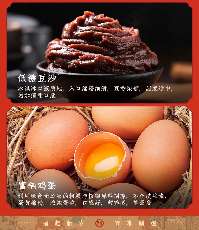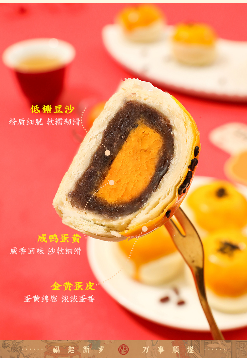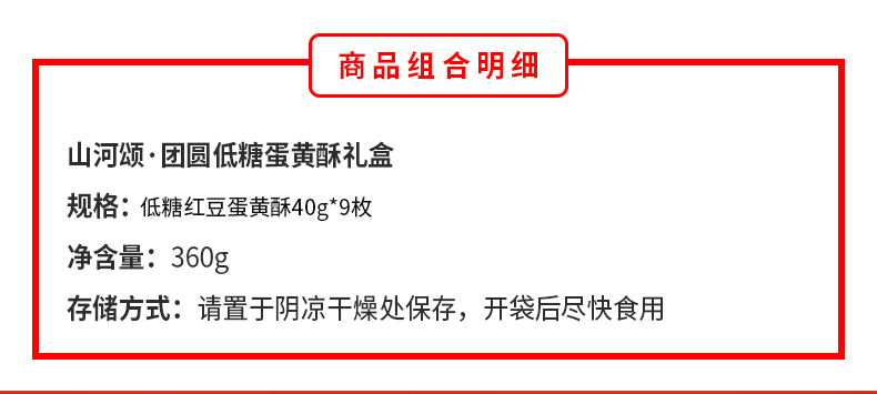 保質期:60天 產品明細: 低糖紅豆蛋黃酥40g*9 產品賣點: 口味與健康并重:低糖配方既滿足了控糖需求,又不犧牲美味,讓傳統蛋黃酥變得更輕盈、更安心。 1、在保留紅豆沙與咸蛋黃這一黃金經典搭配的同時,大膽革新采用低糖配方,顯著降低了甜膩感,使咸甜風味更加突出 2、口感層次豐富,兼具軟糯、酥松與咸香,外層是層層疊疊的酥松外皮,中間是綿密軟糯的低糖紅豆沙,核心是油潤咸香的整顆蛋黃,一口下去,體驗三種截然不同的口感在口中融合 3、匠心配比低糖紅豆沙,品味紅豆的天然豆香,符合低GI理念,用料扎實,風味純正 4、不添加香精、色素、防腐劑,低糖配方??減少身體負擔,讓您在享受傳統美味的同時更加安心