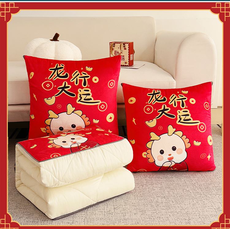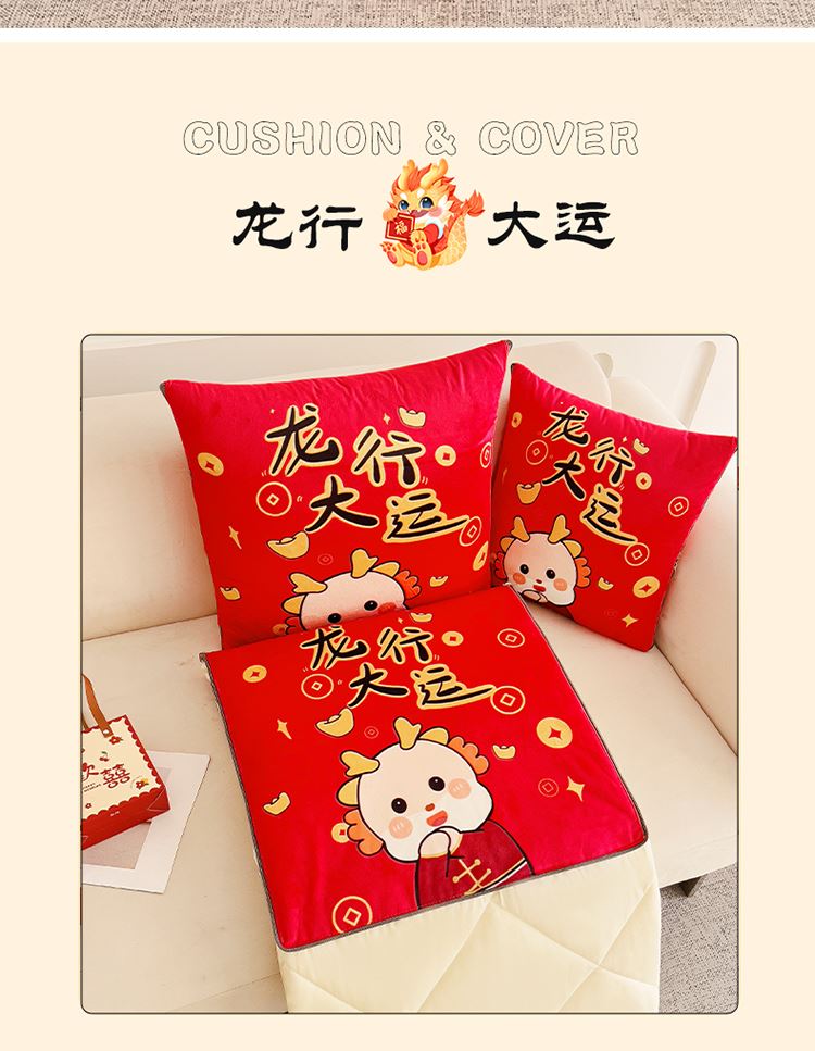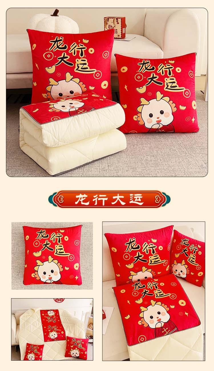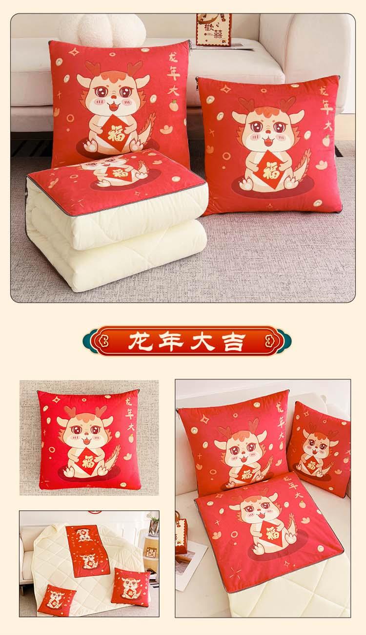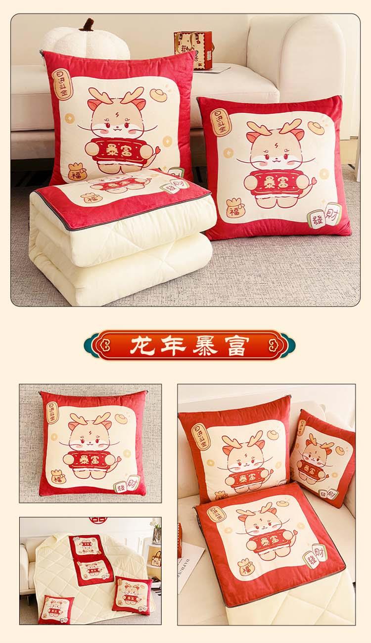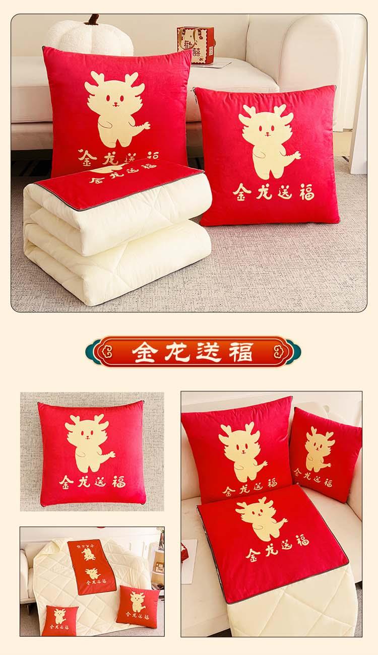 花色:金龍送富/龍年暴富/龍年大吉/龍行大運/人間富婆/可一件定制 規格:折疊40*40cm展開105*150cm 面料:整張無膠棉(聚酯纖維) 填充:水晶絨+親膚磨毛布(聚酯纖維) 工藝:3D數碼印花 國潮當道,超柔水晶絨抱枕被 ,以國潮藝術為靈感展現現在藝術美學, 將中國文化經典傳統元素,用抱枕的形式展現設計新潮 ,寓意美好 一枕多用 ,輕松切換 ,自在隨心, 整張棉填充 ,久用不起坨, 不跑棉 ,久洗耐用, 新一代數碼印花。