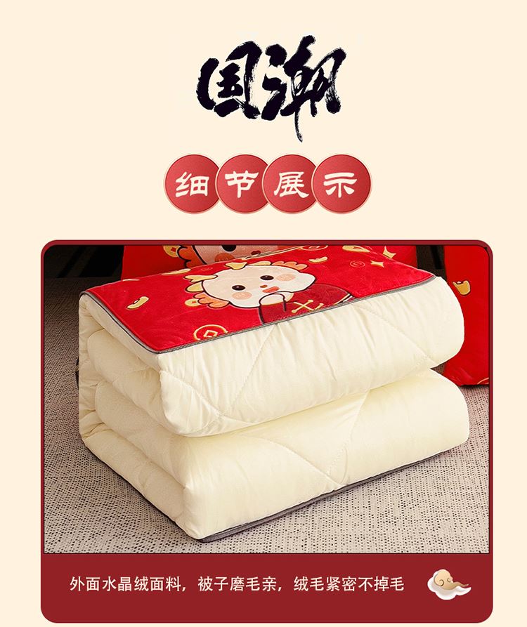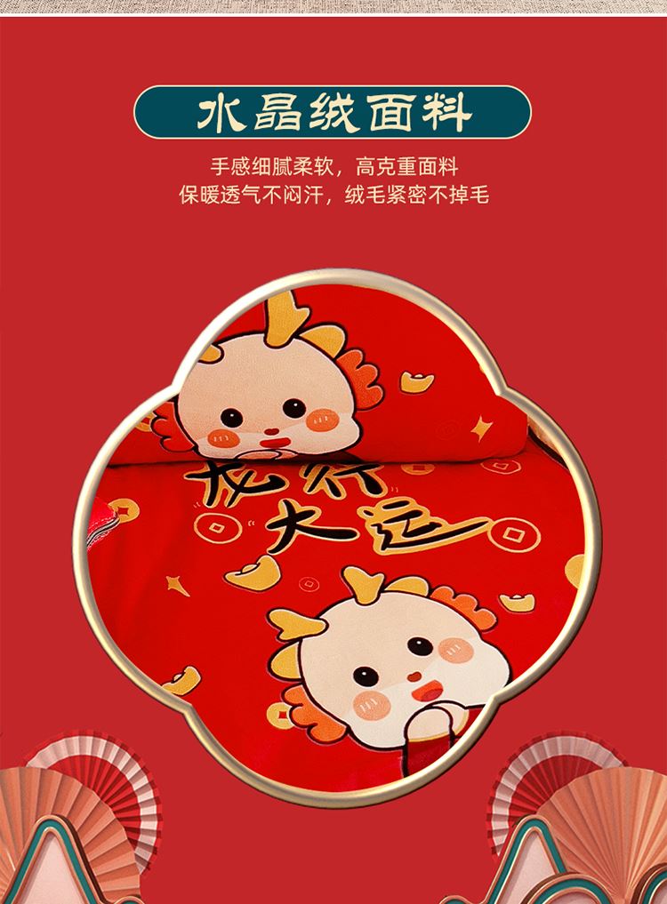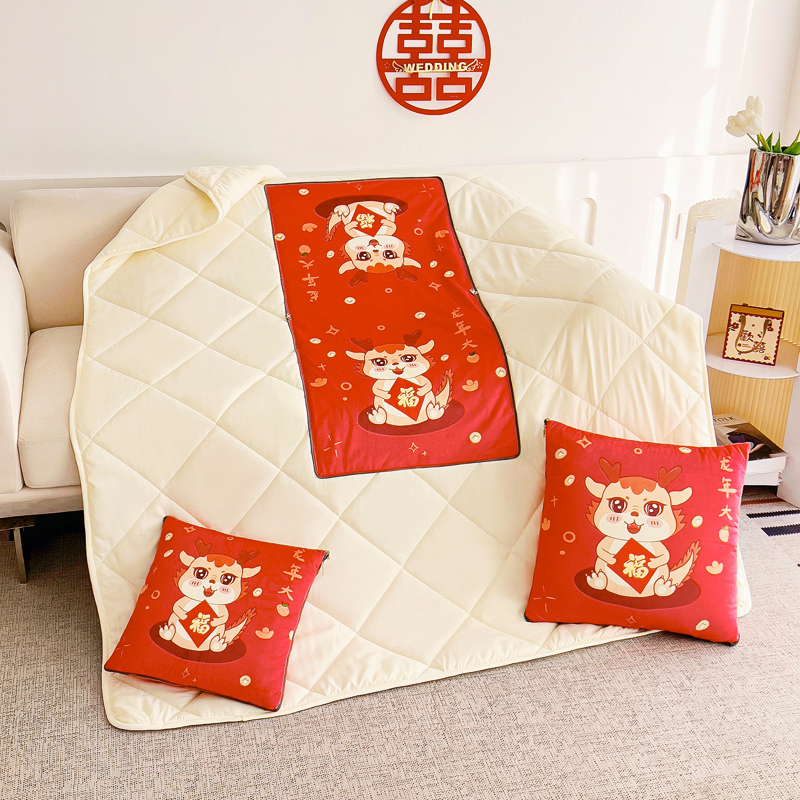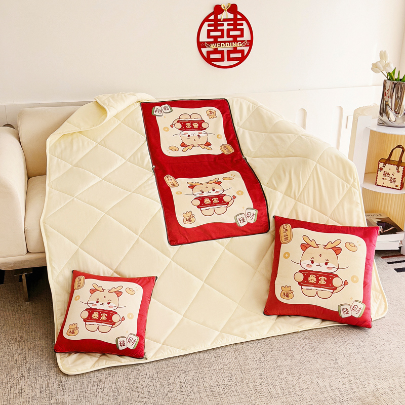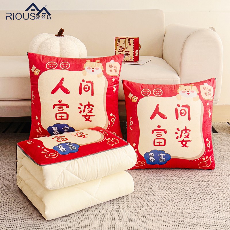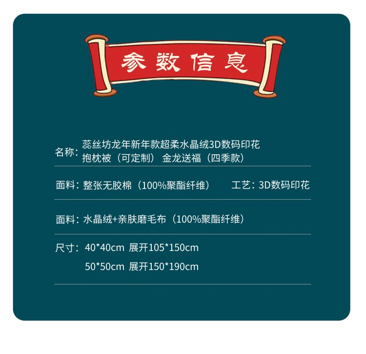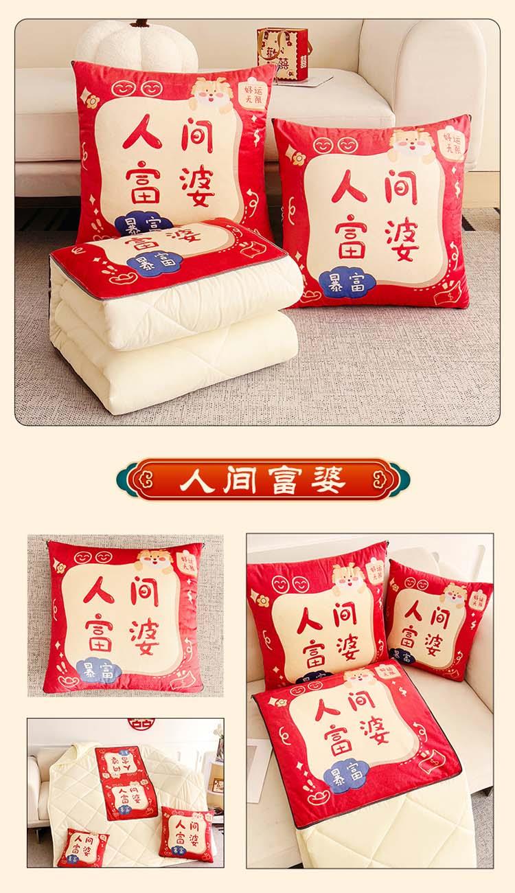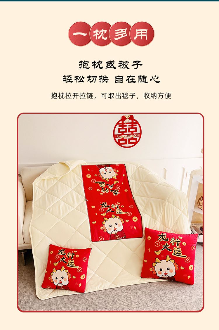 花色:金龍送富/龍年暴富/龍年大吉/龍行大運/人間富婆/可一件定制 規格:折疊40*40cm展開105*150cm 面料:整張無膠棉(聚酯纖維) 填充:水晶絨+親膚磨毛布(聚酯纖維) 工藝:3D數碼印花 國潮當道,超柔水晶絨抱枕被 ,以國潮藝術為靈感展現現在藝術美學, 將中國文化經典傳統元素,用抱枕的形式展現設計新潮 ,寓意美好 一枕多用 ,輕松切換 ,自在隨心, 整張棉填充 ,久用不起坨, 不跑棉 ,久洗耐用, 新一代數碼印花。