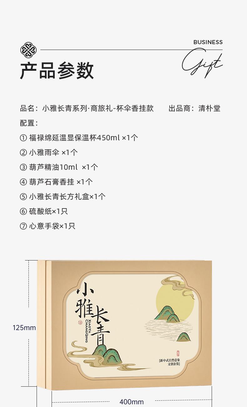配置 · ① 福祿綿延·溫顯杯(450ml) ×1個 ② 小雅·晴雨傘×1個 ③ 葫蘆·精油(10ml)×1個 ④ 葫蘆·石膏香掛×1個 ⑤ 小雅·新中式禮盒手袋×1套