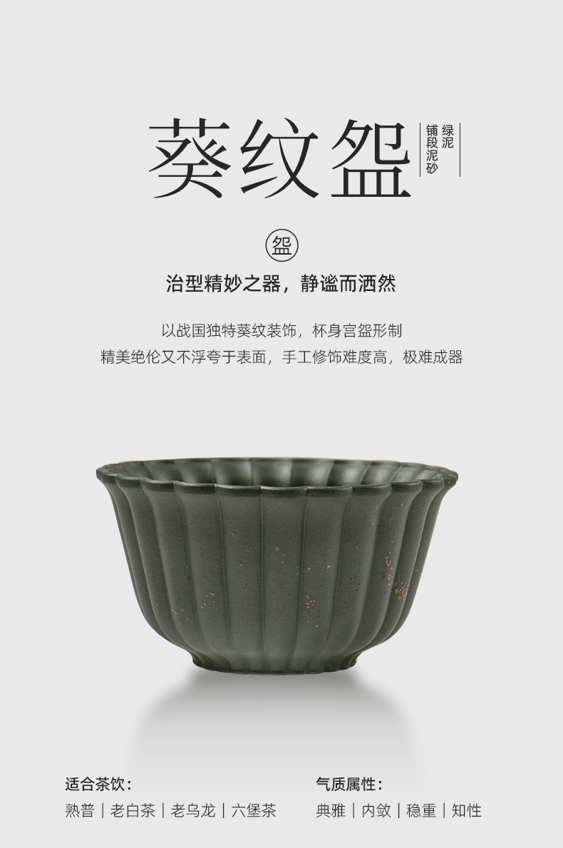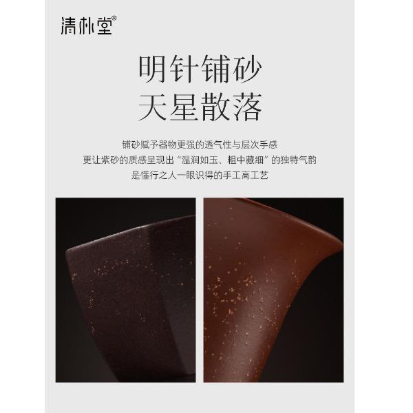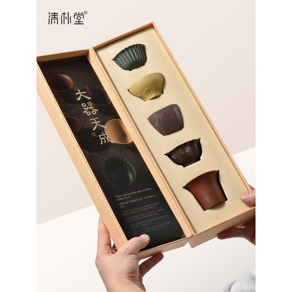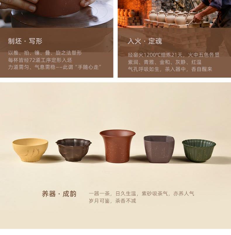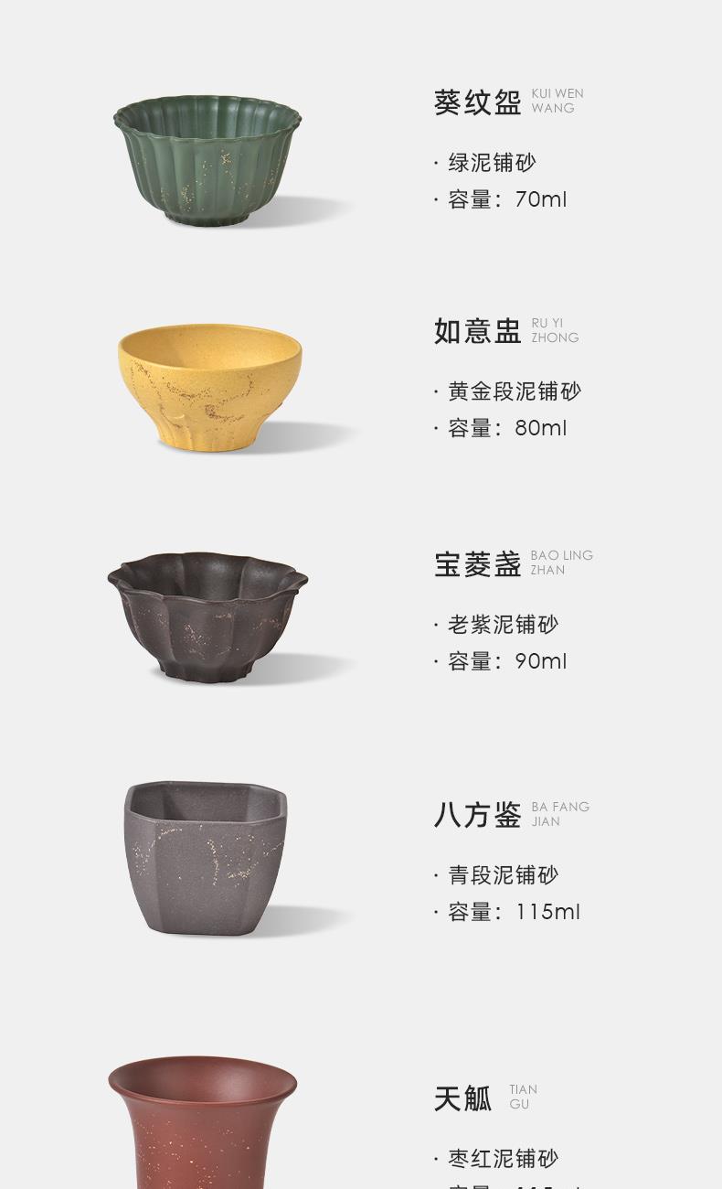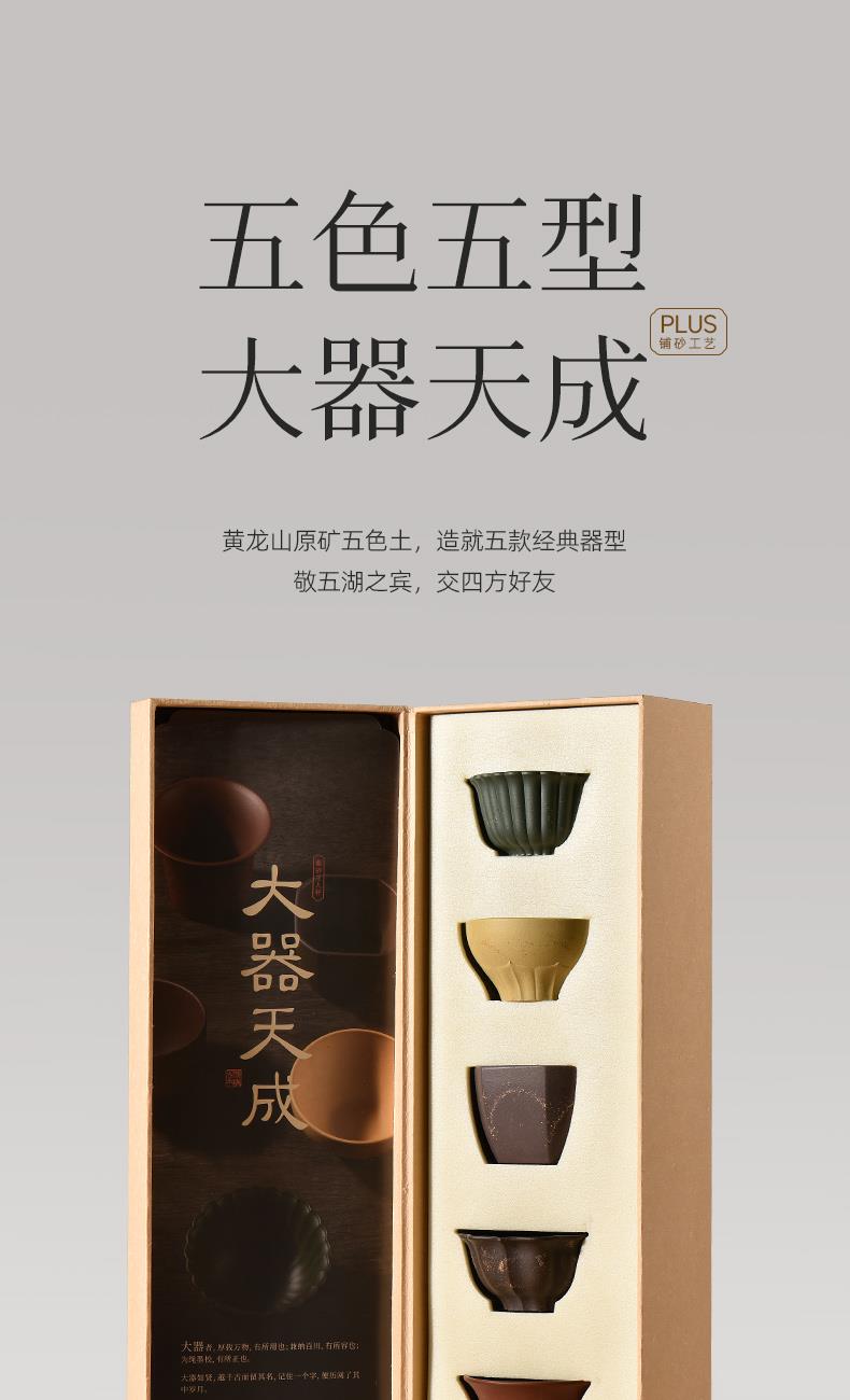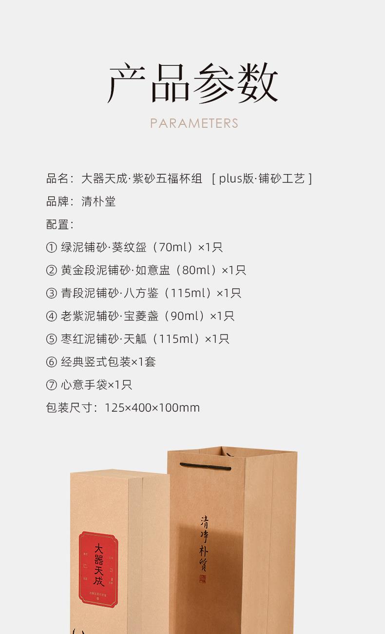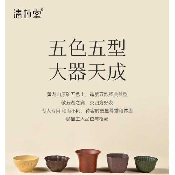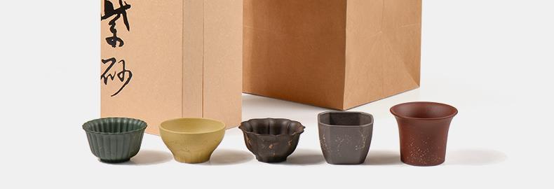 配置 · ① 葵紋盌-綠泥鋪砂 (70ml)×1只 ② 如意盞-黃金段鋪砂(80ml)×1只 ③ 八方鑒-青段泥鋪砂(90ml)×1只 ④ 寶菱盞-老紫泥鋪砂(90ml)×1只 ⑤ 天觚-棗紅泥鋪砂(115ml)×1只 ⑥ 經(jīng)典禮盒手袋×1套