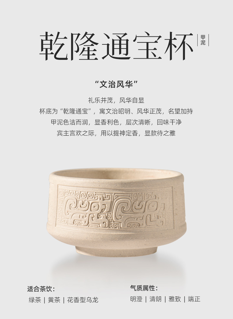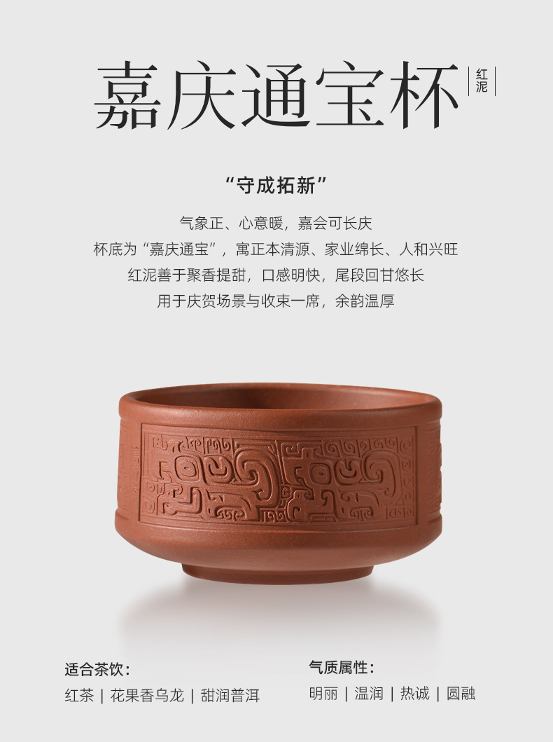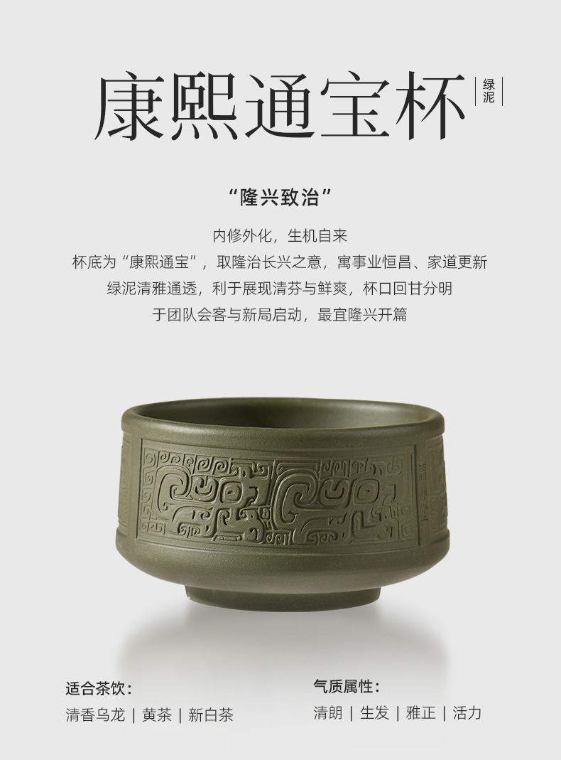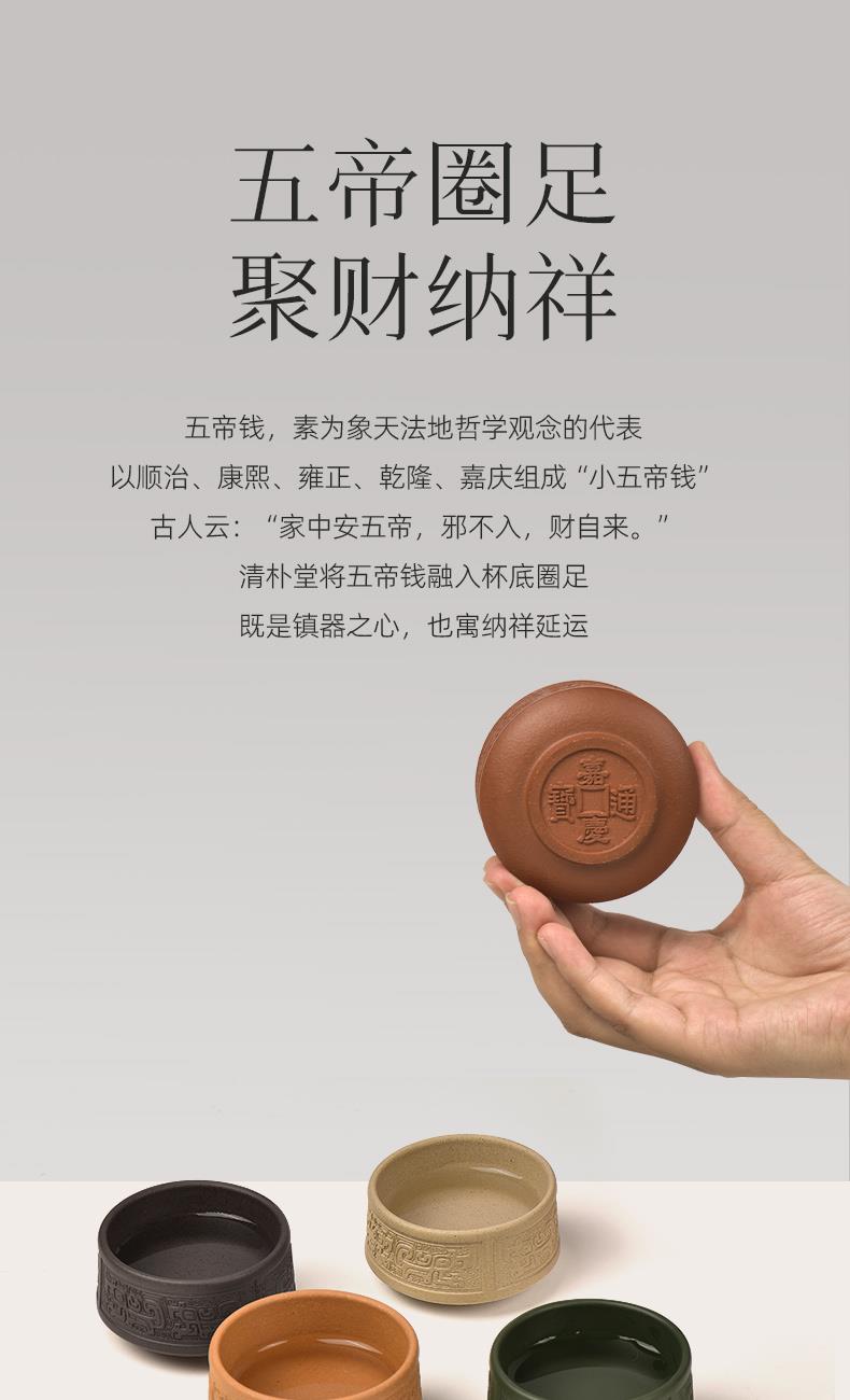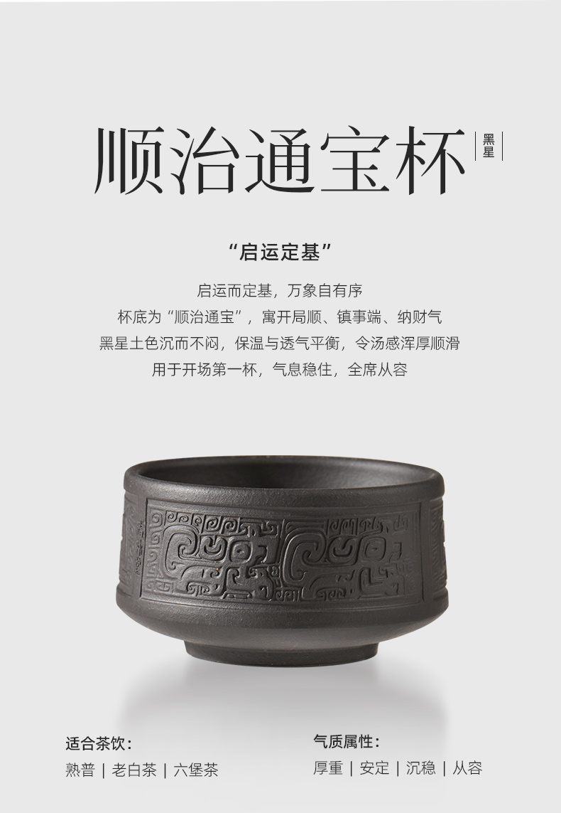 配置 · ① 順治通寶杯-黑星(65ml)×1只 ② 康熙通寶杯-綠泥(65ml)×1只 ③ 雍正通寶杯-段泥(65ml)×1只 ④ 乾隆通寶杯-甲泥(65ml)×1只 ⑤ 嘉慶通寶杯-紅泥(65ml)×1只 ⑥ 經典禮盒手袋×1套