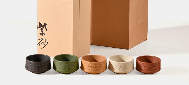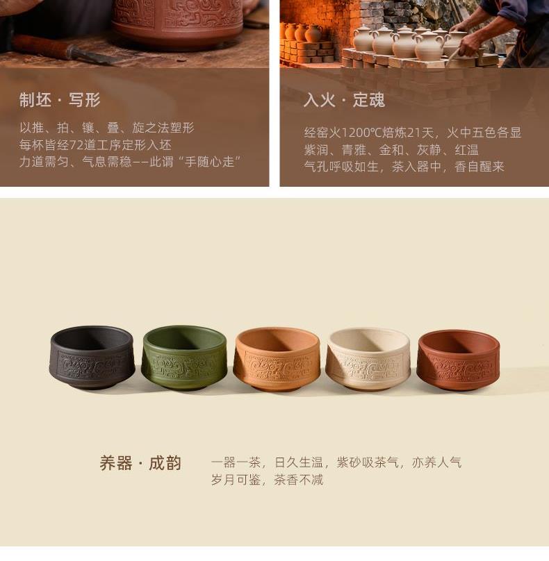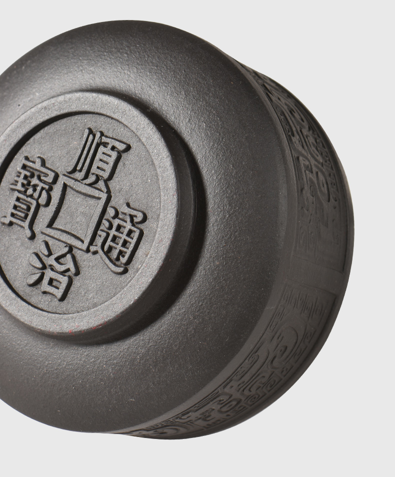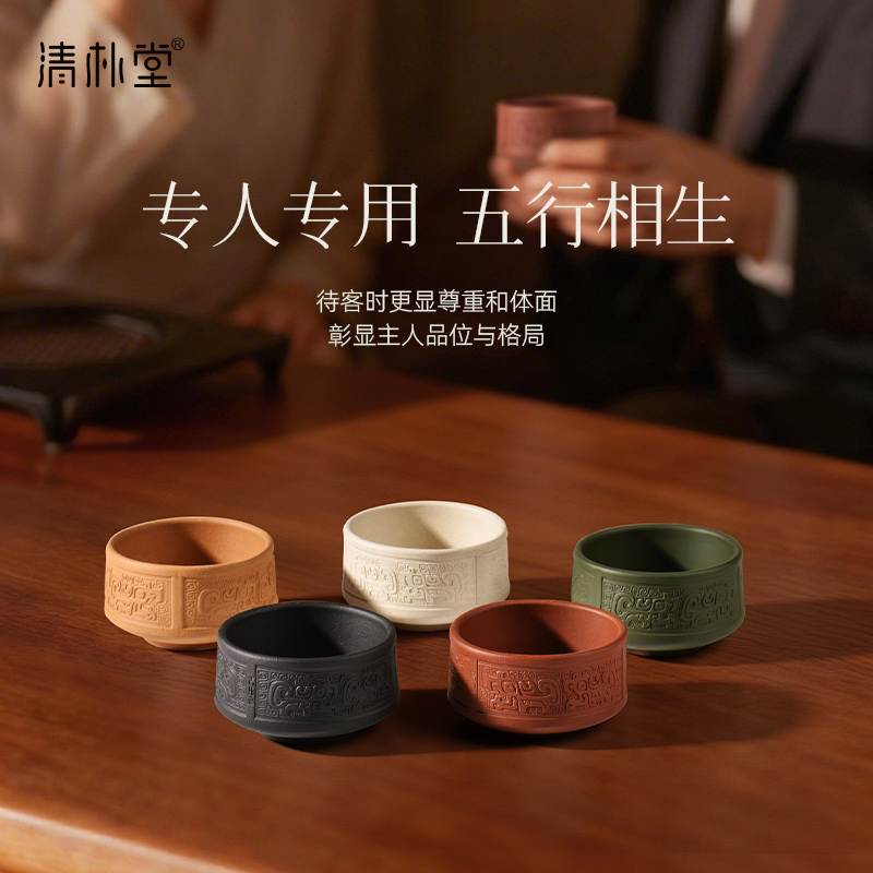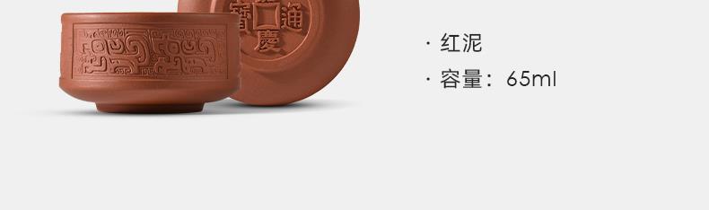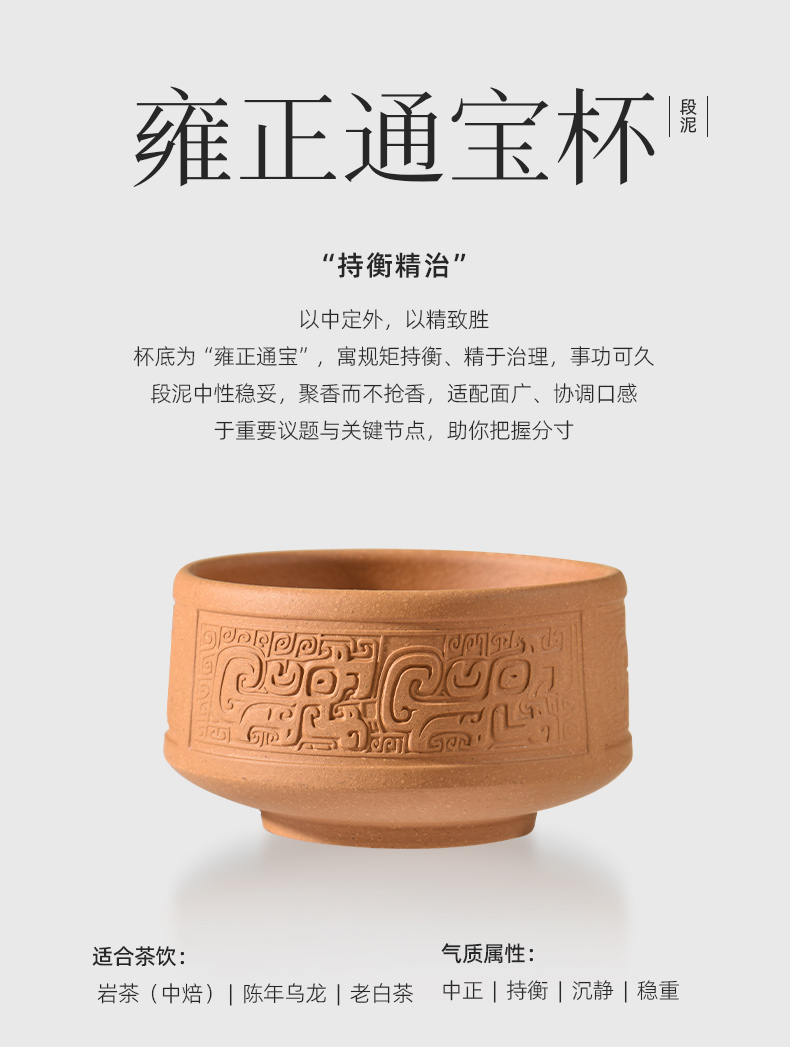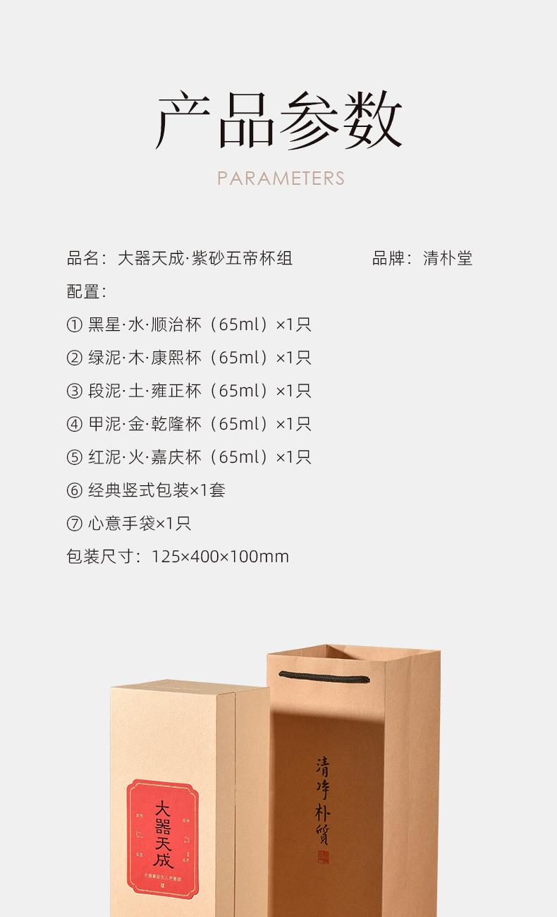 配置 · ① 順治通寶杯-黑星(65ml)×1只 ② 康熙通寶杯-綠泥(65ml)×1只 ③ 雍正通寶杯-段泥(65ml)×1只 ④ 乾隆通寶杯-甲泥(65ml)×1只 ⑤ 嘉慶通寶杯-紅泥(65ml)×1只 ⑥ 經典禮盒手袋×1套
