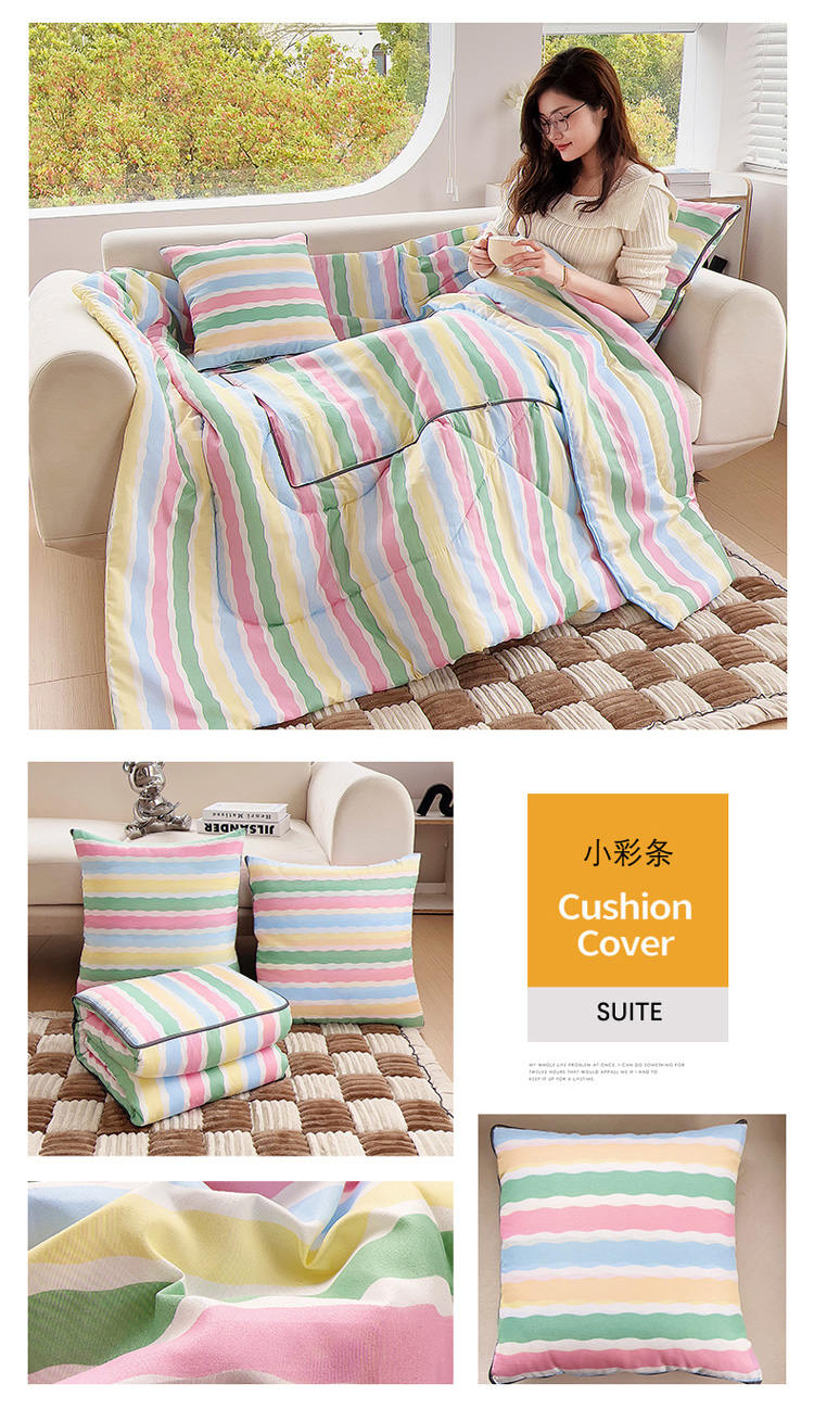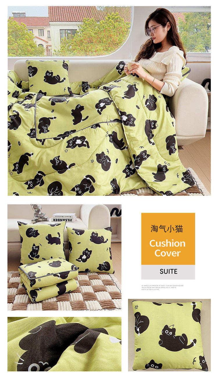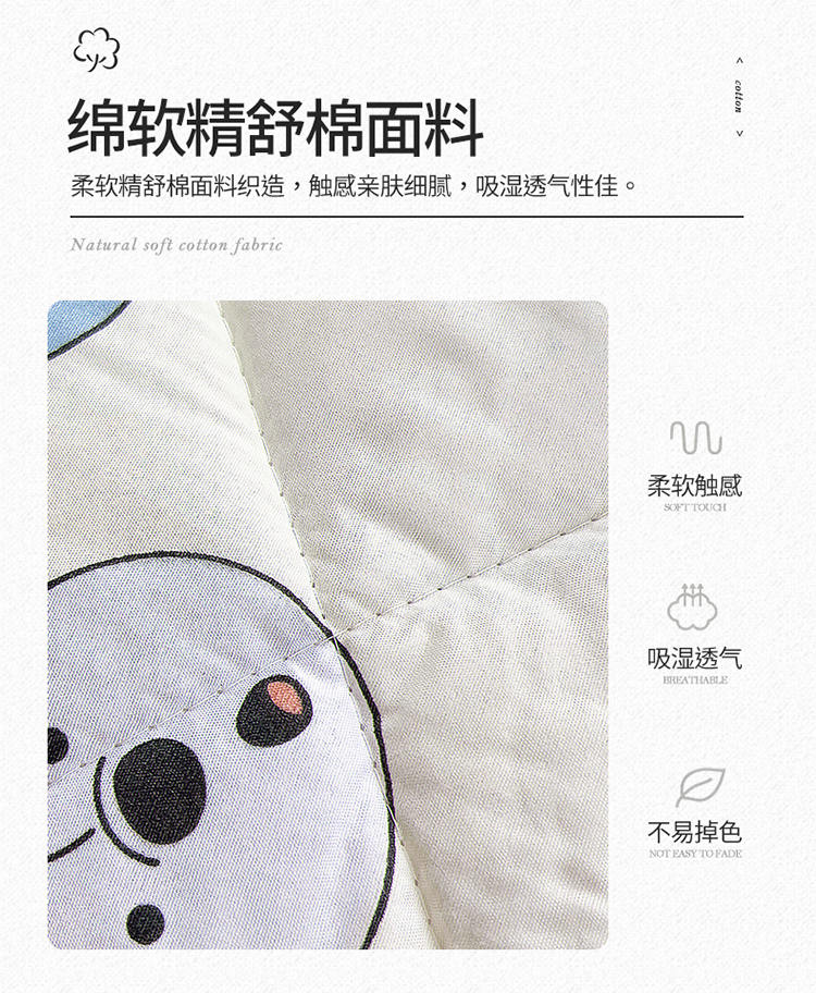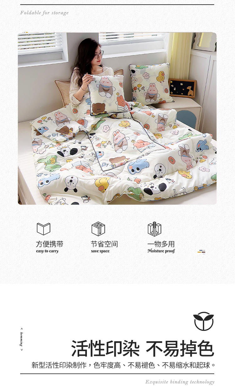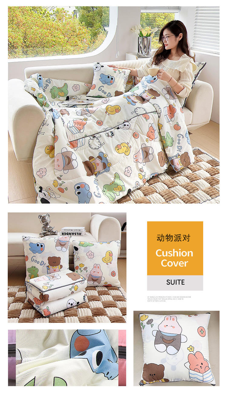 花色:動(dòng)物派對(duì)/格韻-灰/格韻-棕/快樂(lè)萌犬/奶熊軟糖/淘氣小貓/小彩條/心動(dòng) 規(guī)格:折疊40*40cm展開105*150cm 面料:精梳棉面料(聚酯纖維) 填充:pp棉(聚酯纖維) 工藝:活性印染 多功能精舒棉抱枕被,高支高密親膚細(xì)膩,吸濕透氣性佳;pp棉填充,蓬松回彈性好,柔軟舒適,不易板結(jié)起坨;活性印染,色牢度高,不易褪色,不易縮水,不易起球。