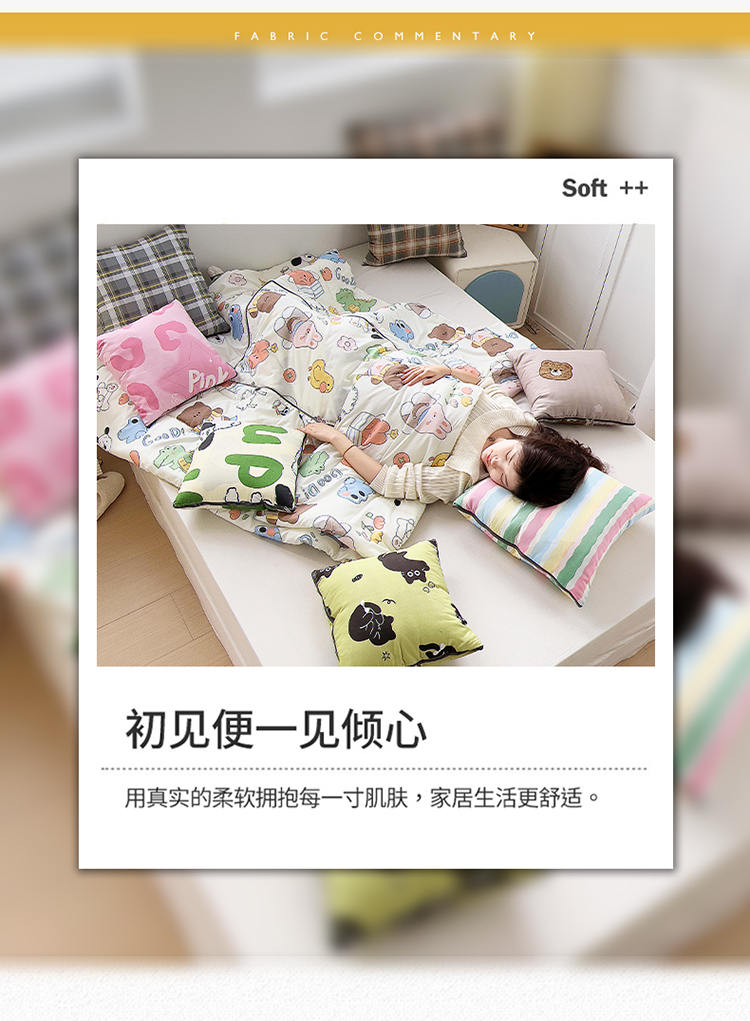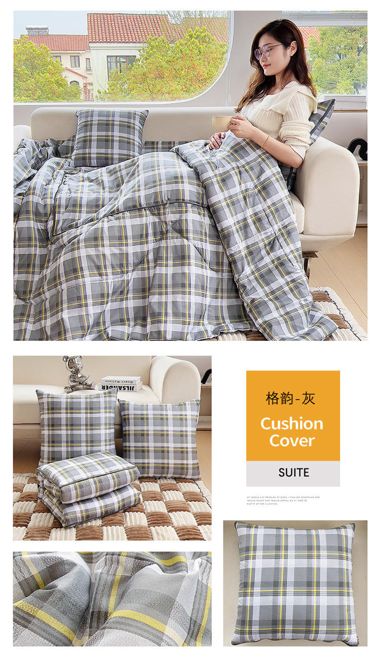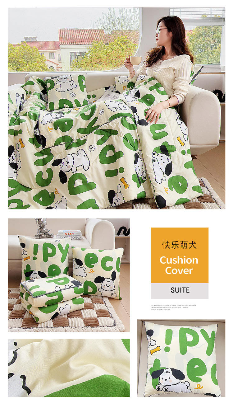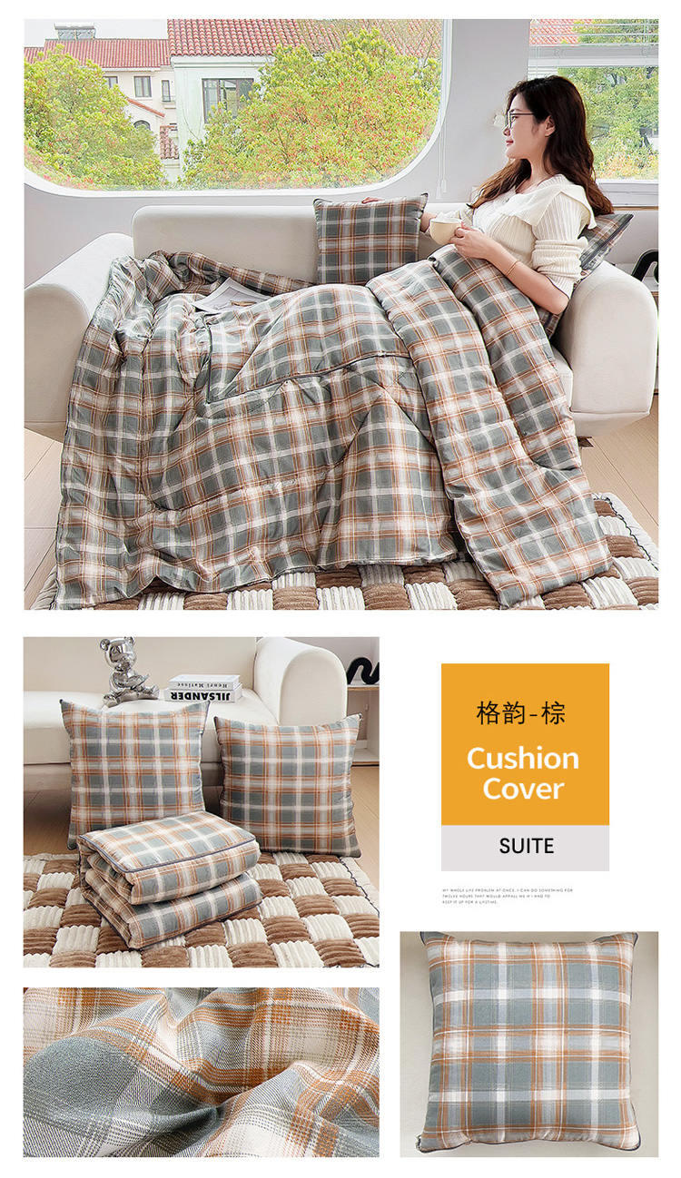 花色:動(dòng)物派對(duì)/格韻-灰/格韻-棕/快樂(lè)萌犬/奶熊軟糖/淘氣小貓/小彩條/心動(dòng) 規(guī)格:折疊40*40cm展開105*150cm 面料:精梳棉面料(聚酯纖維) 填充:pp棉(聚酯纖維) 工藝:活性印染 多功能精舒棉抱枕被,高支高密親膚細(xì)膩,吸濕透氣性佳;pp棉填充,蓬松回彈性好,柔軟舒適,不易板結(jié)起坨;活性印染,色牢度高,不易褪色,不易縮水,不易起球。