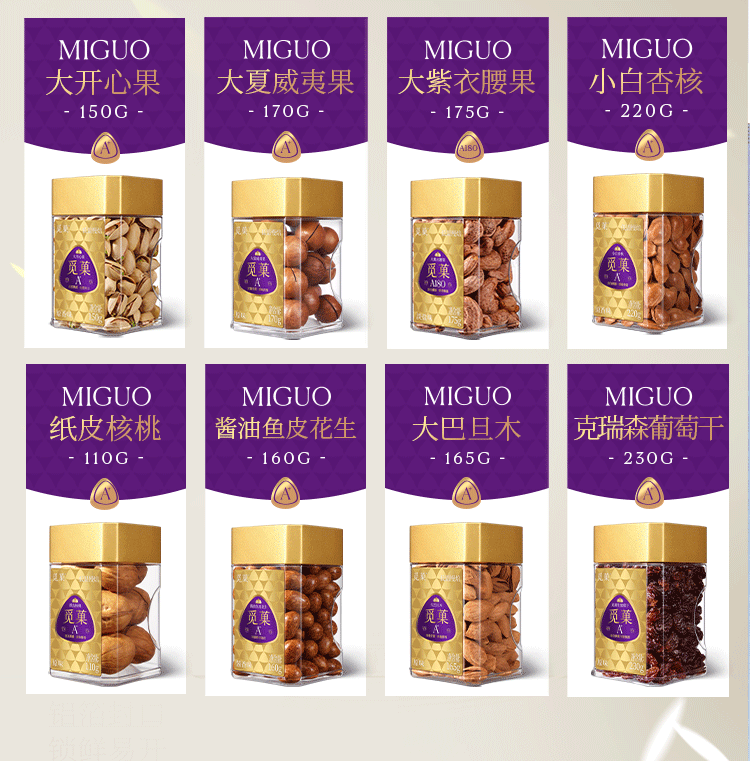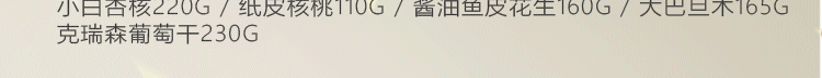 大開心果150g 大夏威夷果170g 小白杏核220g A180大紫衣腰果175g 紙皮核桃110g 醬油魚皮花生160g 大巴旦木165g 克瑞生葡萄干 230g