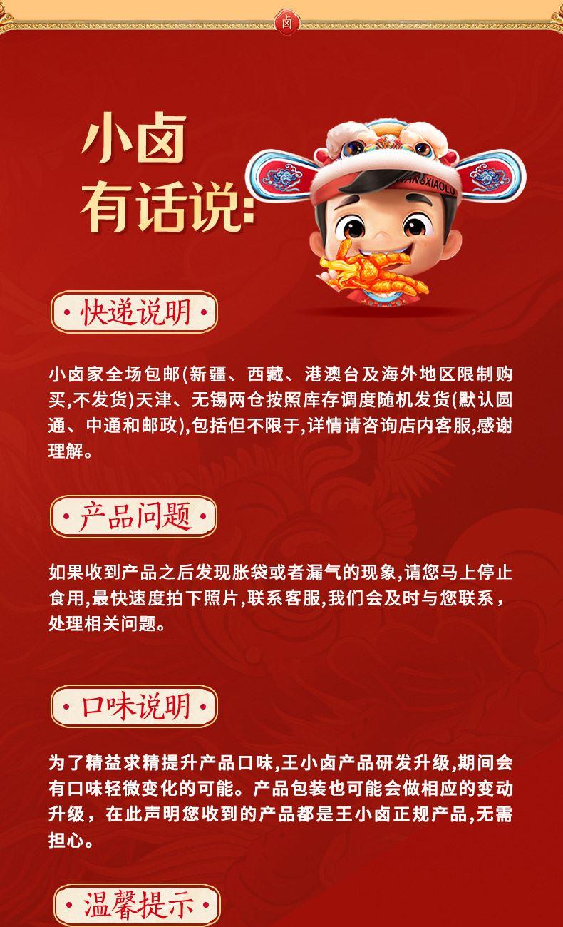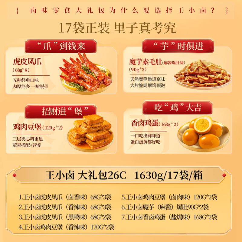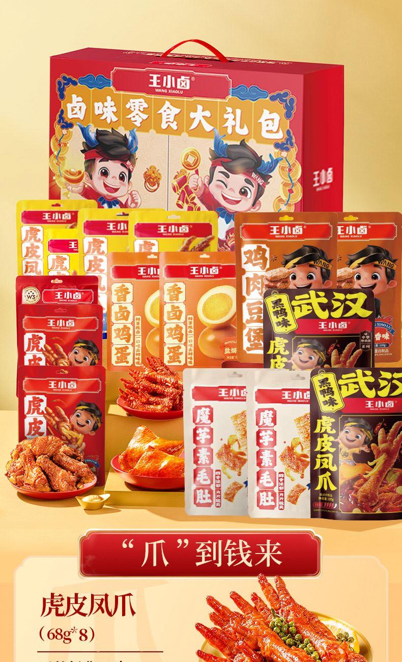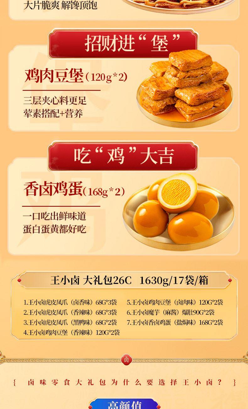 王小鹵虎皮鳳爪鹵香味68g*3袋 王小鹵虎皮鳳爪香辣味68g*3袋 王小鹵虎皮鳳爪黑鴨味68g*2袋 王小鹵雞肉豆堡鹵香味120g*2袋 王小鹵雞肉豆堡香辣味120g*2袋 王小鹵香鹵雞蛋(鹽焗味)168g*2袋 王小鹵魔芋麻醬爆肚90g*3袋