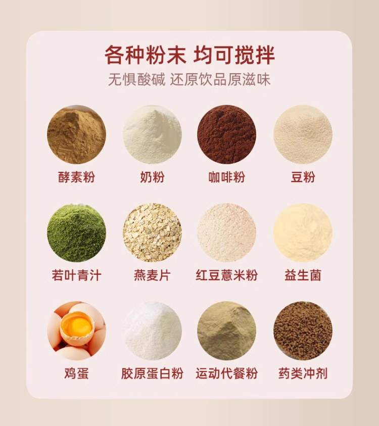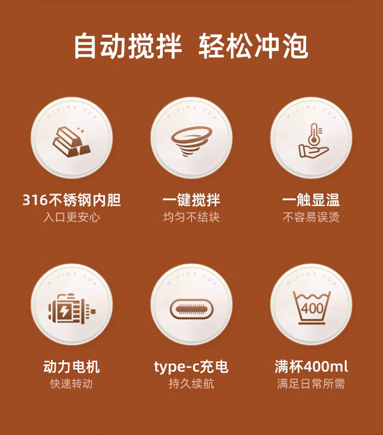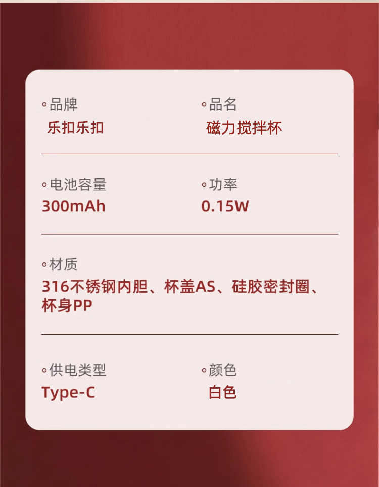 功率:0.15W 電壓:5V/1A 容量:400mL 毛重:0.3Kg 材質:PP+316不銹鋼+AS 彩盒包裝尺寸:100*100*152mm 外箱包裝尺寸:520*430*333mm 推薦理由: 1、AS安全材質,內膽316安全材質 2、Type-C充電接口,充電方便 3、高速磁力攪拌刀頭,快速均勻攪拌 4、溫度顯示,不燙口