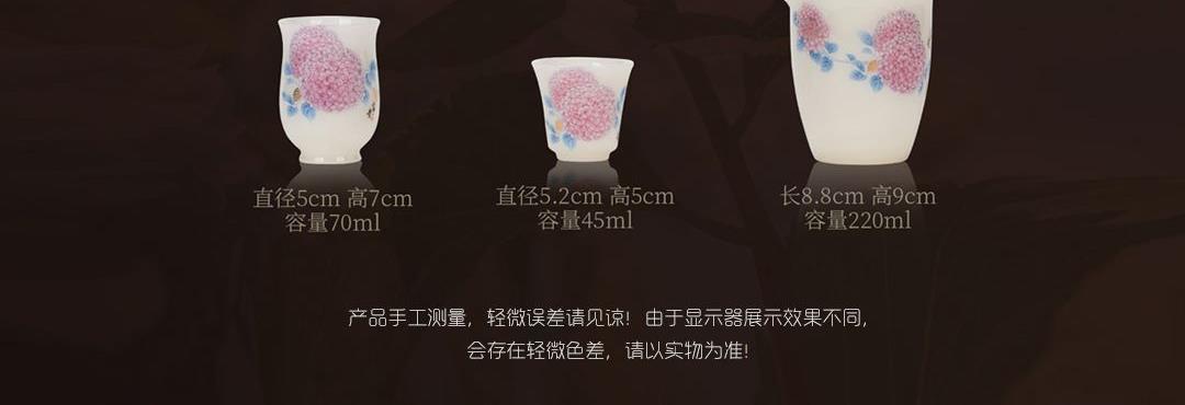 配置:茶壺*1,茶碗*1,茶杯*6,主人杯*1,茶海*1,過濾組*1. 尺寸:茶壺12.3*7cm 容量170ml, 茶碗11.2*8.8cm 容量140ml, 茶杯5.2*5cm 容量45ml, 主人杯5*7cm 容量70ml, 茶海8.8*9cm 容量220ml, 過濾組8.3*5.8cm。 禮盒:43*12.5*28cm。